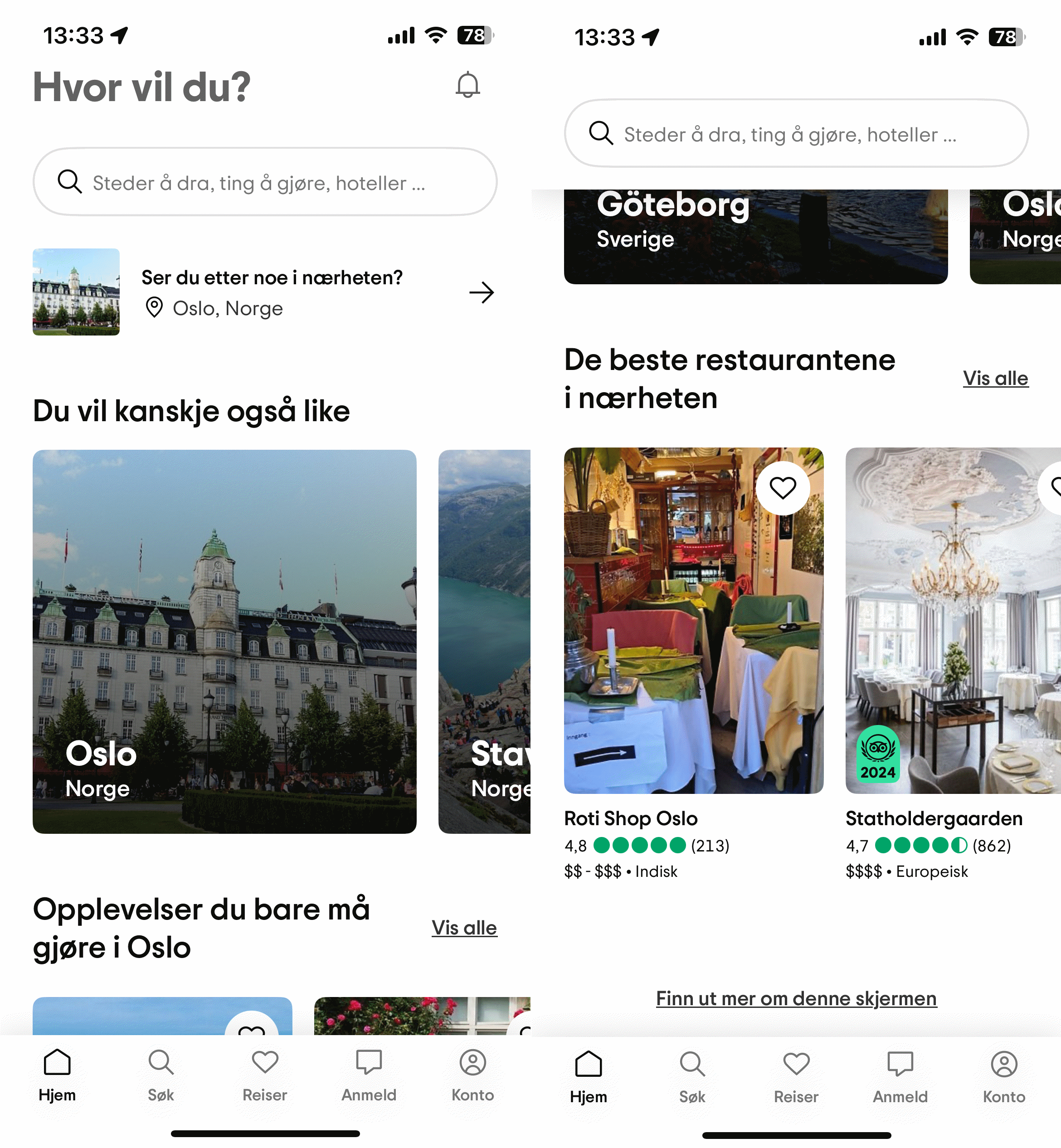 For moro skyld har vi også lagt ved litt fra mobilappen også i bildet under. Den finner omtrent de samme tingene som nettsiden og siden vi er logget inn begge steder, får vi også opp de samme forslagene.