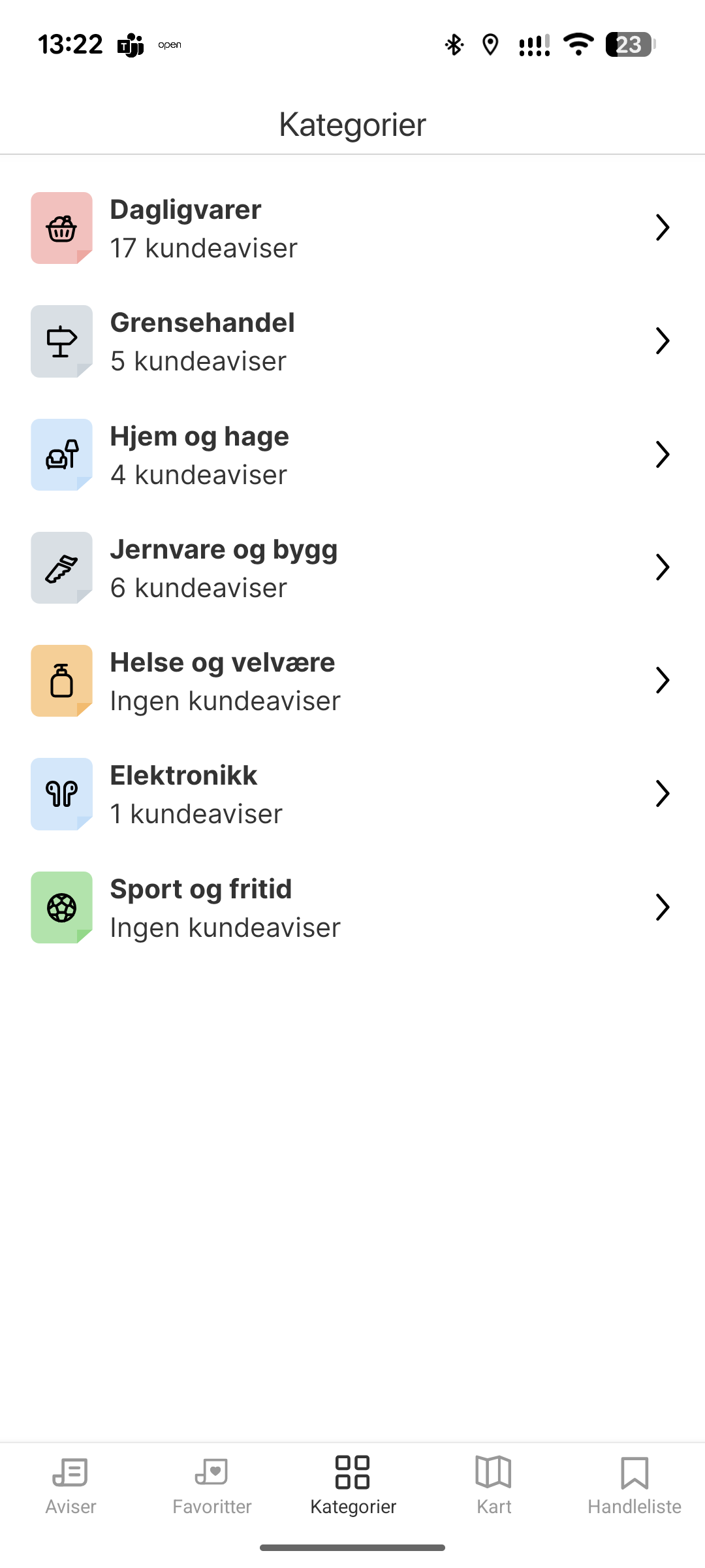 Her ser vi tilbudsaviser under kategorien Dagligvarer. Det er flere enn det er plass til på én side. Du må derfor rulle nedover for å se flere. (Du ruller nedover ved å sette fingeren et sted nede på skjermen og dra den oppover).
