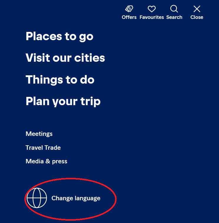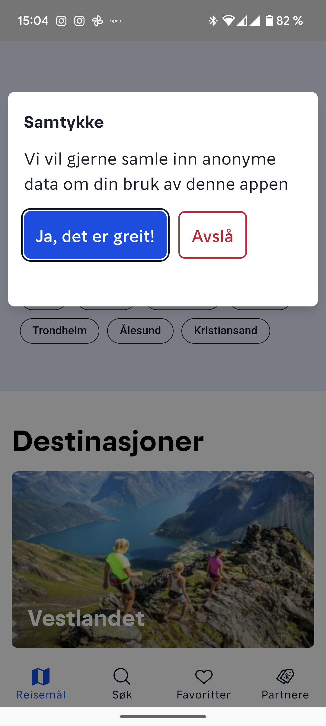 Deretter får du opp bilde der du kan finne opplysninger om reisemål. Du kan søke eller velge landsdel (du må rulle nedover for å se alle forslagene):