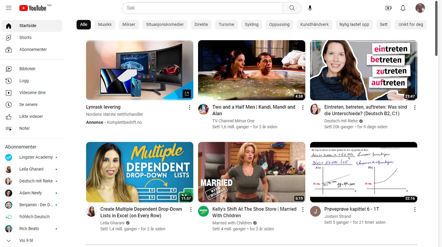 Det som vises på startsiden vil være ulikt fra person til person. Den er styrt av såkalte algoritmer som vet hva du har sett på tidligere og prøver å finne videoer som ligner.