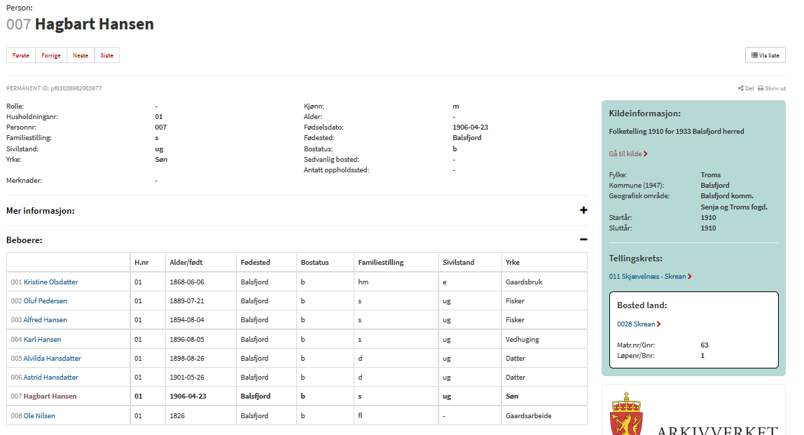 Hvis jeg klikker på navnet til min morfar (markert på bildet over) får jeg opp følgende side: