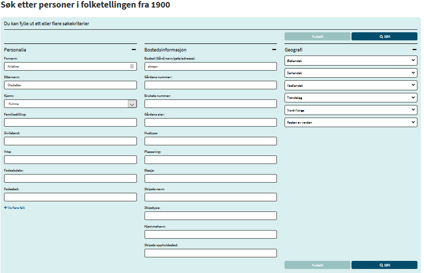 Siden jeg har funnet min oldemor men ikke oldefar ved å søke etter morfar så går jeg til folketelling 1900 og søker etter Kristine Olsdatter siden jeg ønsker å vite mer om henne.