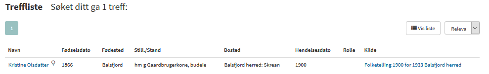 Jeg fant ut tidligere at min morfars mor var enke i 1910. Så nå prøver jeg å finne henne igjen i 1900 for å se om jeg finner ut hva hennes mann het, altså min oldefar. Jeg får 1 treff på mitt søk fordi jeg hadde mange flere opplysninger nå enn da jeg søkte etter morfar.