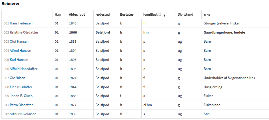 011 Petra Olsdatter er enslig losjerende hus moder og gift. Jeg tolker det som at hun er søster av Kristine og at hennes mann i 1900 er fisker og ikke til stede under folketellingen. Siden 010 er utelatt i denne oversikten.