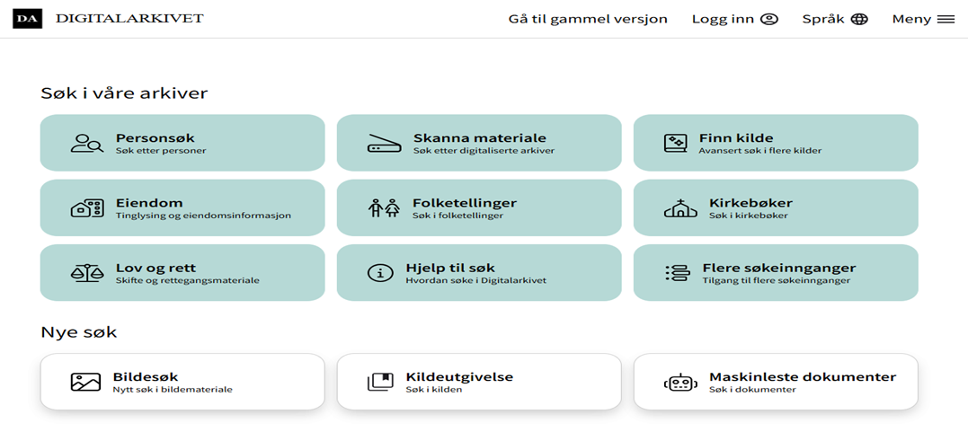Når du begynner med Digitalarkivet sine sider finner du en oversikt over de forskjellige «arkivene» du kan søke i.