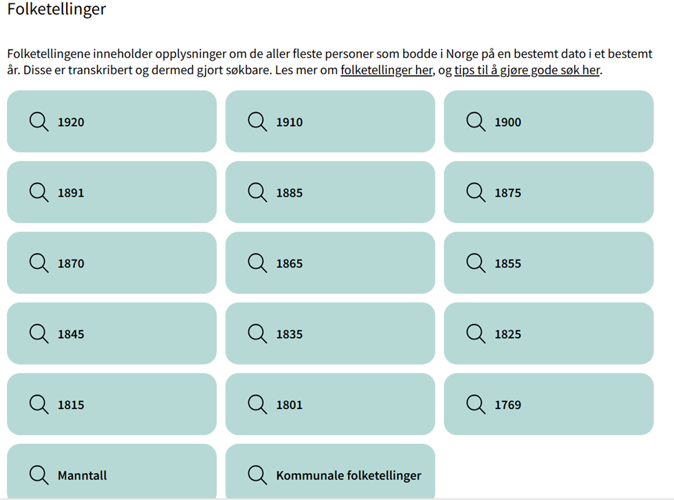 Folketellingen fra 1920 er fortsatt litt mangelfull, og den ble tilgjengelig 1. desember 2020, men det er ikke sikkert at du finner din kommune ennå, undersøk gjerne det før du begynner å søke.