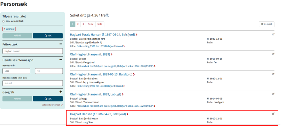 I mitt eksempel så er det 4367 treff på Hagbart Hansen og jeg er heldig som finner han på første side. Hvis den du søker etter ikke er på første siden må du klikke deg videre til neste side til du finner vedkommende. Du må være sikker på at du klikker på den riktige personen slik at du ikke ender opp med å søke på feil slekt.