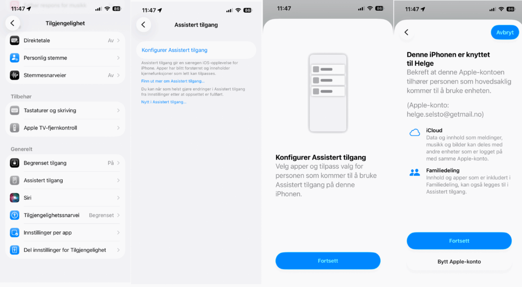Start med å gå til «Innstillinger», «Tilgjengelighet», trykk på «Konfigurer Assistert tilgang», trykk deretter «Fortsett» og «Fortsett» hvis Apple-kontoen er korrekt.