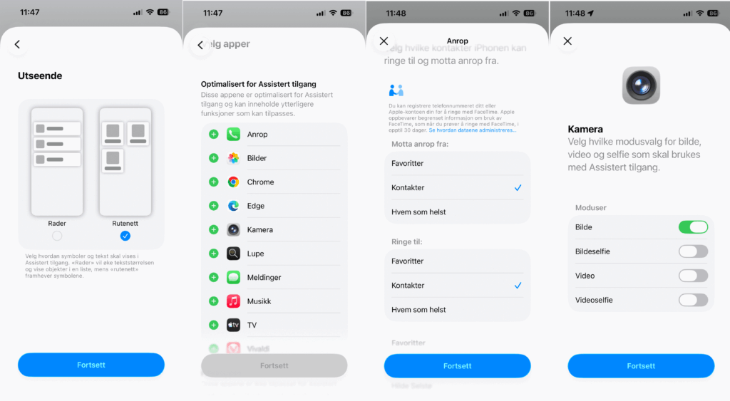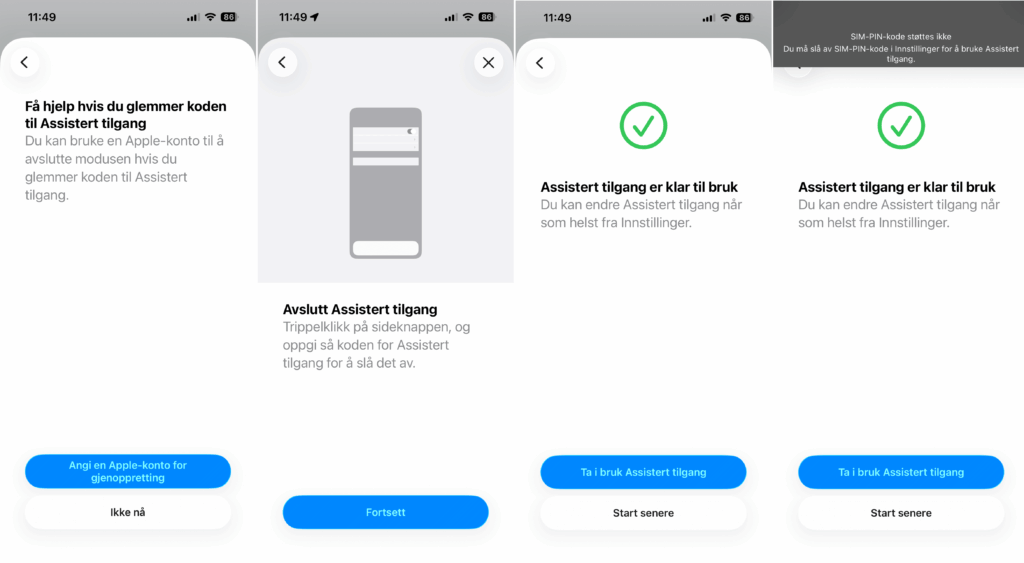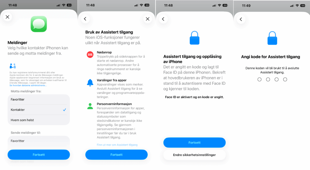 Til slutt velger du «Fortsett» etter hvert valg og du kommer tilbake til valgsiden, som du så i bildet over dette. Etter at noen valg er gjort kan du fortsette og får info om iOS-funksjoner som virker annerledes. Du får valg om å endre sikkerhetsinnstillinger, men hvis du har aktivert Face-ID og kode, kan du trykke «Fortsett». Du må nå angi kode (PIN) for assistert tilgang. Denne koden brukes også for å avslutte assistert tilgang.