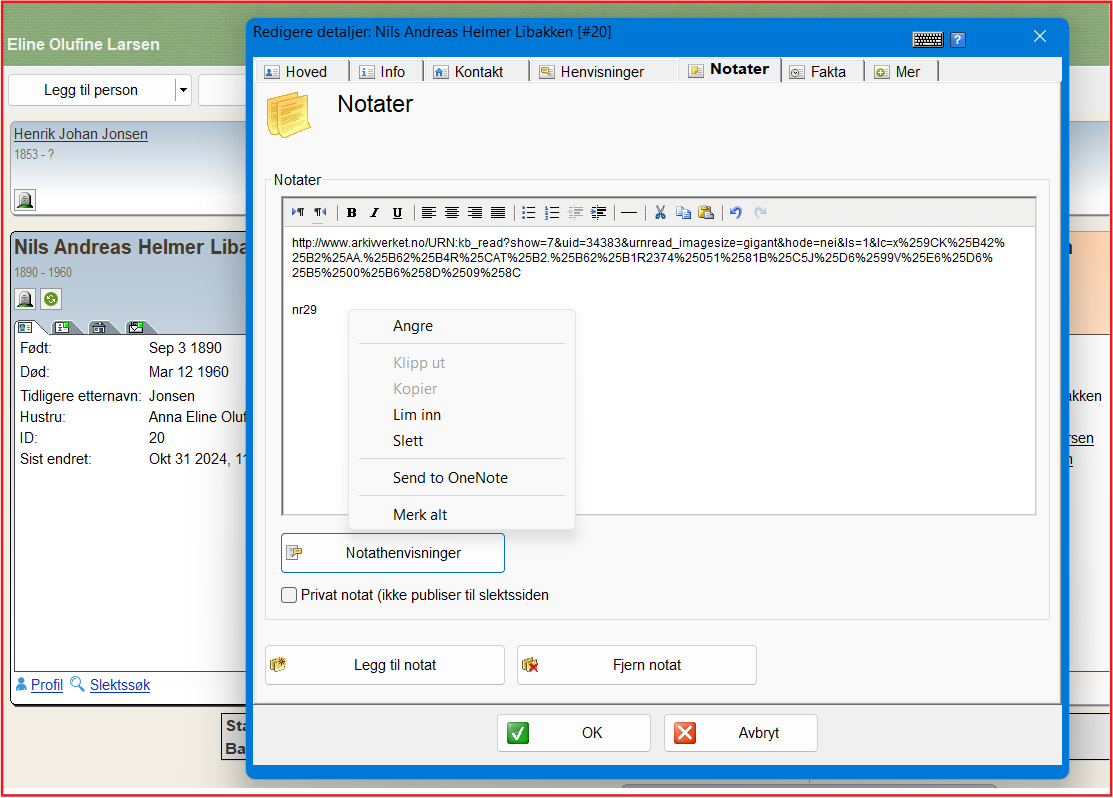 I mitt eksempel har jeg valgt å lagre lenken under personen det gjelder (Nils Andreas Helmer Libakken) og finner frem til fanen som heter «notater» (se bildet for eksempel). Der limer jeg inn internettadressen. Dette vil nok se litt forskjellig ut avhengig av hvilket slekts forskningsprogram du velger å bruke. Bli kjent med ditt program.