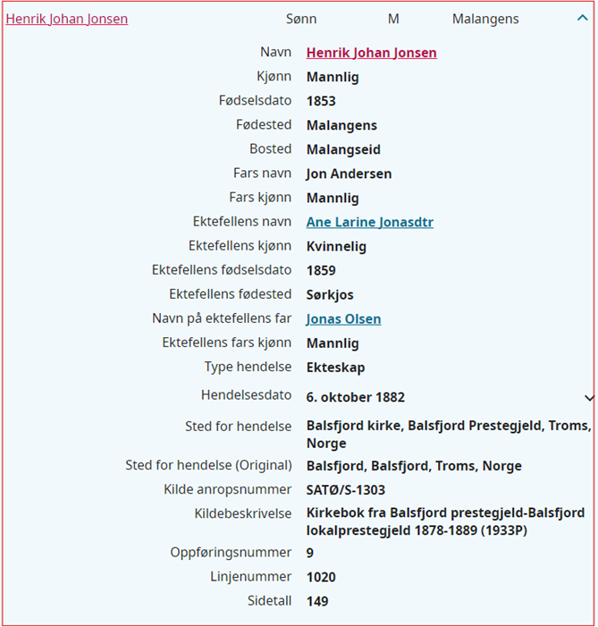 Disse opplysningene finner jeg ved å klikke på navnet til min oldefar der det er registrert ekteskap.