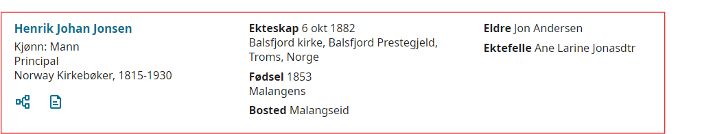 For å bruke siden som en søkemotor begynner du med å klikke på søk og velger opptegnelser for å søke på navn. Jeg skal se om jeg finner mer opplysninger om min farfars foreldre Henrik Johan Jonsen og Ane Lovise Jonsdatter. Jeg skriver inn navnet Henrik Johan Jonsen og Norge, Troms og får treff i samsvar med mitt søk. Jeg fikk 86 499 treff på mitt søk og flere av treffene dreier seg om samme person. I mitt tilfelle finner jeg 2 ekteskap, fødsel og begravelse. Siden han var gift 2 ganger må jeg derfor være sikker på at min farfars mor blir riktig. En slektsforsker må være litt detektiv for å finne riktige opplysninger. Vær derfor kritisk når du søker for å være sikker på at den personen du har funnet er riktige person.