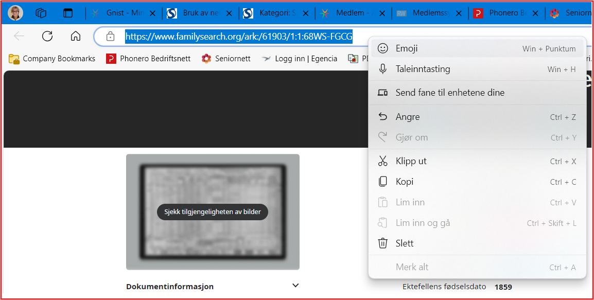 Deretter åpner du programmet som du skal kopiere denne til (for eksempel slektsforsker programmet ditt) og høyreklikker der du ønsker informasjonen og velger «lim inn». Vær nøye med at du legger informasjonen slik at du lett finner den igjen.