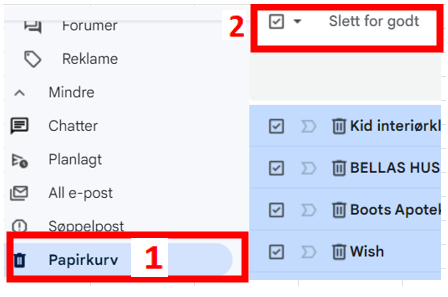 Viktig å huske på på å tømme søppelbøtten etter oppryddingen. Normalt vil papirkurven tømmes automatisk etter 30 dager, men har du plassproblemer i e-posten din så er det en fordel å tømme papirkurven med en gang.
