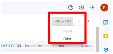 For å gjøre det samme på gratis e-post fra Google må du klikke på tallet som viser hvor mange e-poster du har i innboksen din, for deretter å velge «Eldst». Vi viser her hvordan du gjør dette fra en PC. Om du skal gjøre det fra smarttelefon er det