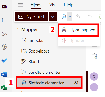 Husk å tøm mappen slettede elementer. Microsoft epost.