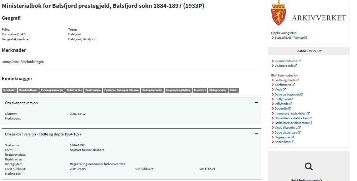 Dersom jeg klikker på Ministerialbok for Balsfjord prestegjeld får jeg mulighet til å se i boken ved å klikke på ordlyden Fødte og døpte som står helt til høyre i bildet på neste side. Ved å bla i boken vil jeg etter hvert komme til oppfølgingen av min farfar. Jeg må bla helt til side 37 i kirkeboken før jeg finner min farfar der. Her får du også informasjon om faddere og ikke minst at min farfar ble regnet som «Ægte».