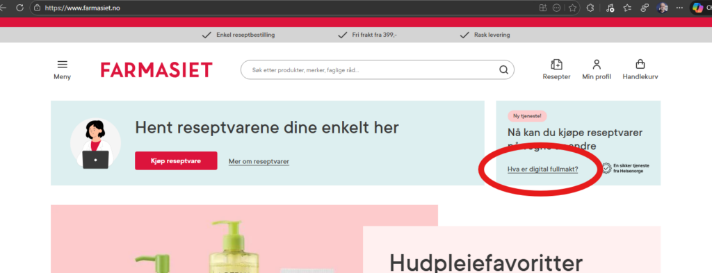Hvis du går tilbake til forsiden til farmasiet.no ser du øverst til høyre, vi har markert med en rød sirkel rundt «Hva er digital fullmakt», klikk på den.