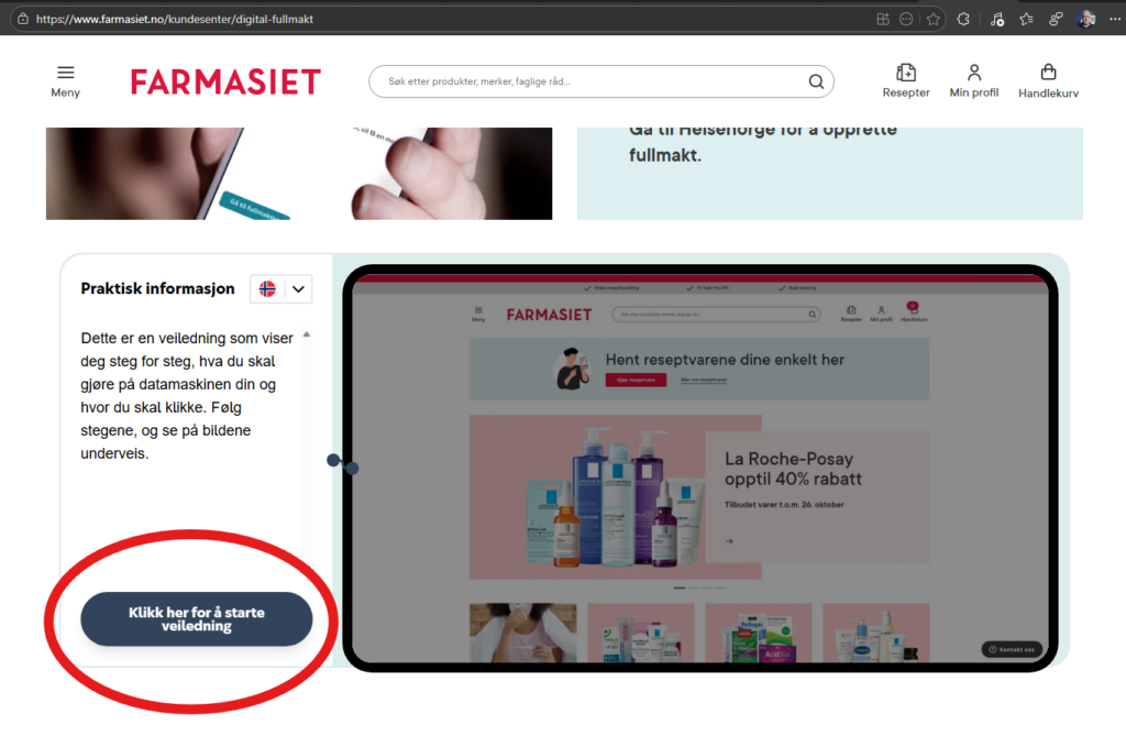 På siden du kommer til, rull litt nedover til du ser bildet under og klikk på «Klikk her for å starte veiledning» og du får en full visuell gjennomgang av hvordan du bestiller reseptvarer når du har fullmakt til å gjøre det.