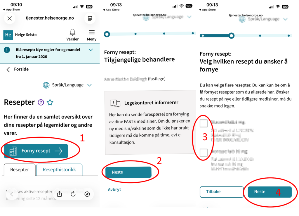 - Trykk «neste», det er info fra legekontoret om fornying i tekstboksen