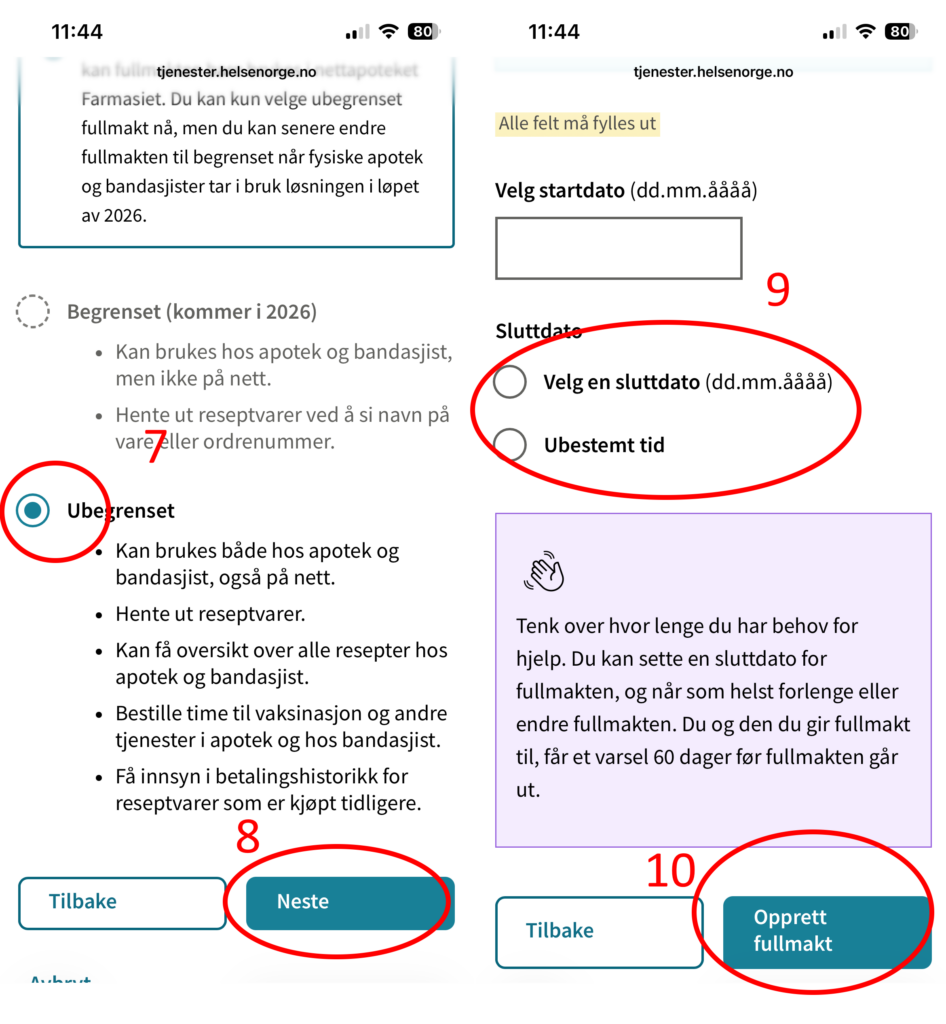 - Trykk på «Gi fullmakt så andre kan hente ut reseptene dine» en gang til (du er nå i fullmaktsdelen)
