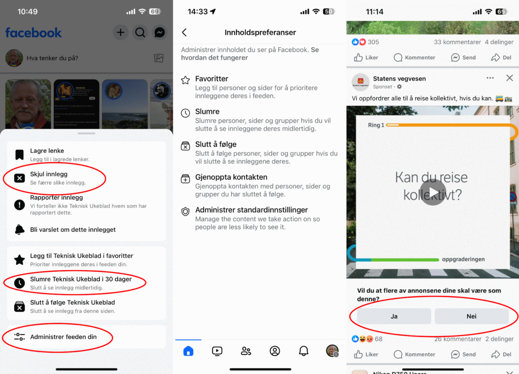 Bildet viser noen av mulighetene du har til å reagere på innlegg for å tilpasse feeden din. Bildet i midten viser mulighetene hvis du trykker på «Administrer feeden din»