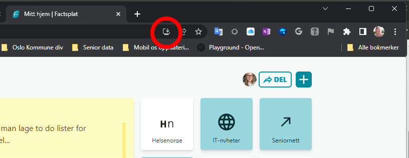 På PC er det også mulig å installere Factsplat som en app, i Google Chrome vil det være et ikon synlig i adressefeltet, for å legge inn Factsplat som app, trykk på ikonet som er vist i bildet under.
