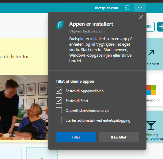 Når du trykker på ikonet i rød sirkel over, dukker det opp to valg, da skal du klikke på «Installer» og du får Factsplat festet nede på oppgavelinjen. Neste gang du skal åpne Factsplat, trykker du på ikonet på oppgavelinjen.