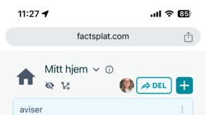 På Apple-produktene bruker du delingsknappen ,  og i menyvalgene som dukker opp trykker du på «Legg til på hjem skjerm». Da får du et Factsplat-ikon på første ledige plass på hjemskjermen din. Hvis du trykker på det ikonet, åpner du Factsplat direkte. Det blir akkurat som om du åpner en app.