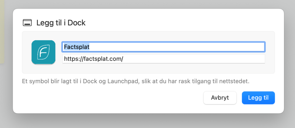 I Safari åpner du factsplat.com. På menylinjen velger du Fil > Legg til i Dock.
