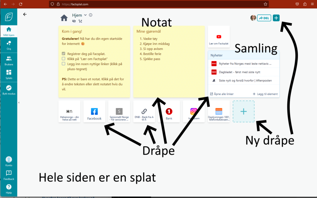 Splat: Din personlige startside. På splaten kan du ha lenker, samlinger og/eller notater. Alt dette kaller vi dråper.