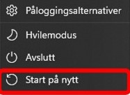 Noen ganger kan det hende at du ikke får åpnet programmer, eller det er noe annet som ikke fungerer som det skal etter at du har skrudd på PC-en. Det kan skyldes at Windows ikke har fått med seg alt, når du startet opp PC-en din. For å løse dette må du starte PC-en på nytt igjen. Men, og dette er viktig; da skal du ikke skru av PC-en ved å velge «Avslutte», for så å starte på nytt med å skru den på igjen.  Du skal klikke på valget «Start på nytt». Da vil PC-en starte helt fra bunnen av.