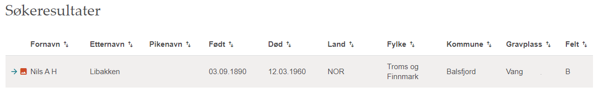 Jeg leter etter min farfar og siden jeg ikke vet hele navnet så skriver jeg inn Nils A H Libakken, velger fylke og kommune. Med opplysningene skrevet inn klikker jeg på søk og får opp ett treff som ser ut for å være riktig.