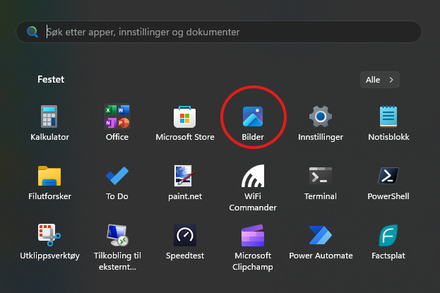I denne artikkelen skal vi se på hvordan du kan gjøre dette enkelt og kjapt. Vi bruker programmet Bilder som finnes på alle Windows 11 maskiner.  Bruken av programmet ser vi på steg for steg. Hvis du klikker på startknappen får du opp de programmene du har festet der. Bilder er markert med rød sirkel.