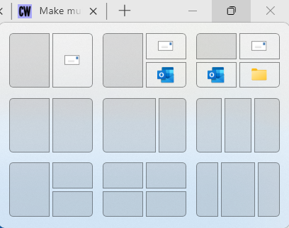 Det enkleste er å dele skjermen i to slik du ser øverst til venstre. Eller dele i tre slik du ser midterst øverst. Eller hvilken som helst av de andre forslagene du ser i snap-verktøyet. - Du velger den oppdeling du ønsker ved å klikke på den.