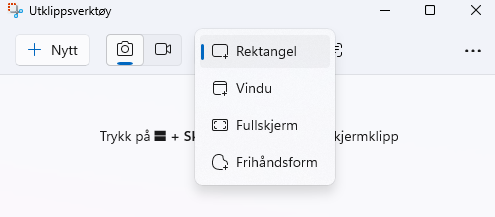 Frihåndsform Tegne en frihåndsfigur rundt et objekt. Rektangel Dra markøren rundt et objekt for å lage et rektangel. Vindu Velg et vindu, for eksempel en dialogboks, som du vil ta skjermbilde av. Full skjerm Ta bilde av hele skjermen. Videoklipp Ta et videoklipp av et rektangulært utvalg av hvilken som helst del av skjermen du liker. Standardvalg er «Rektangel».