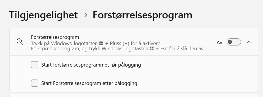 • Innstillinger: Gå til Start > Innstillinger > Tilgjengelighet > Forstørrelsesprogram. Der kan du slå av og på forstørrelse.