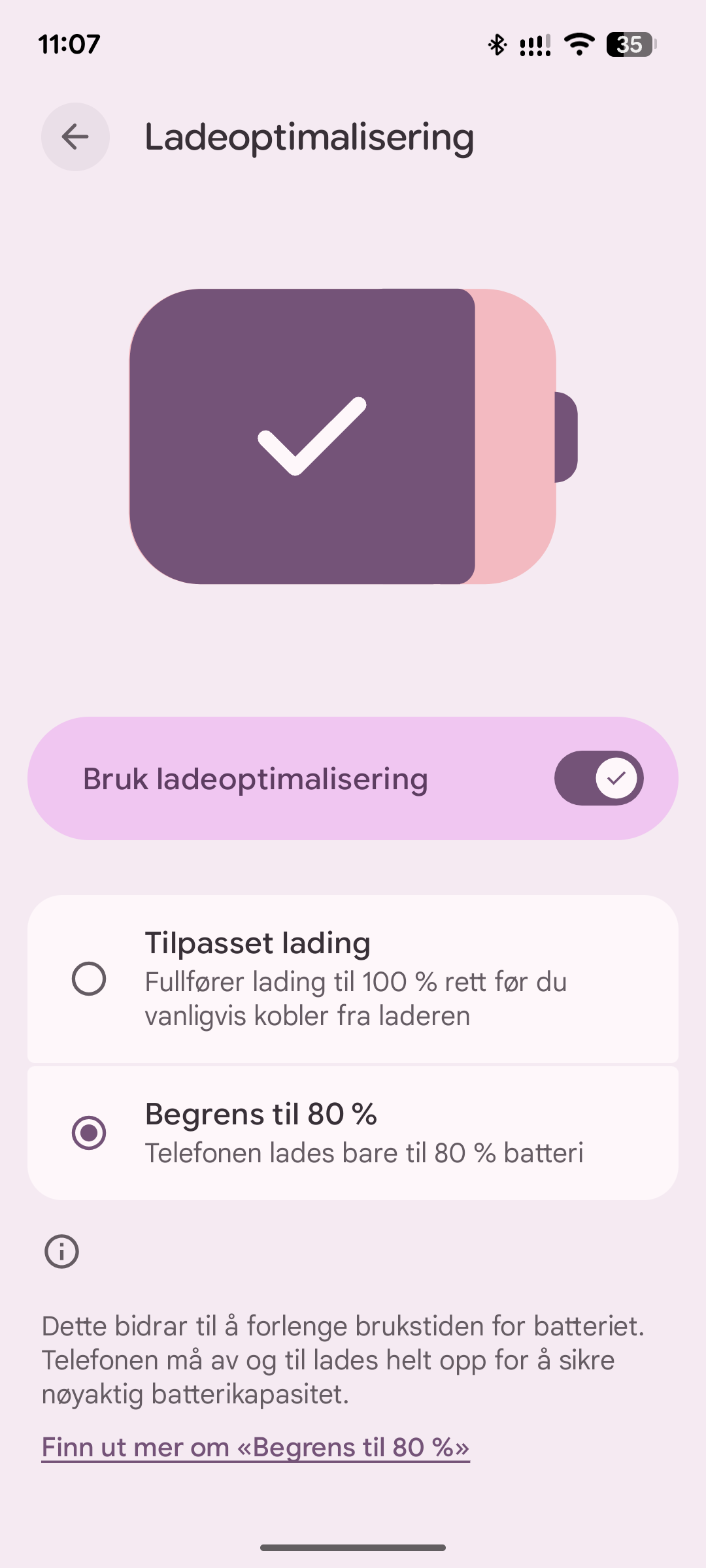 Pixel: På denne modellen er det to ulike måter å sette på batteribeskyttelse.