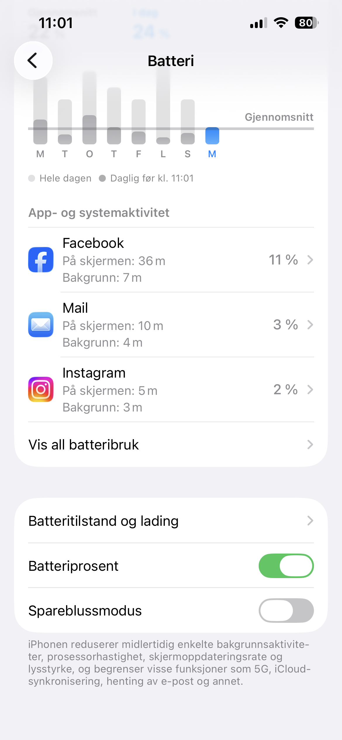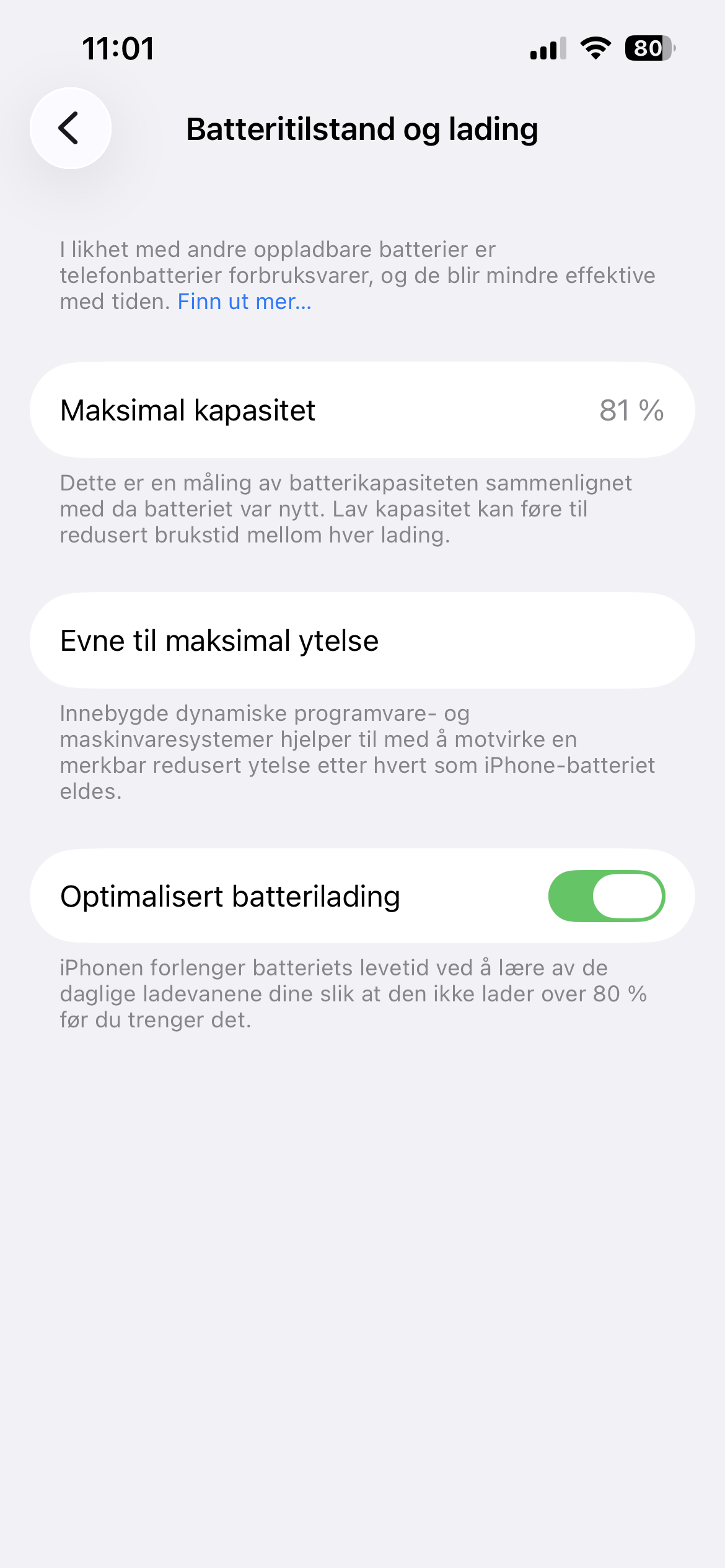 Husk også at hvis du har satt opp en optimalisering som begrenser hvor mye batteriet lades opp, bør du slå denne av de gangene du virkelig trenger å lade til 100%.