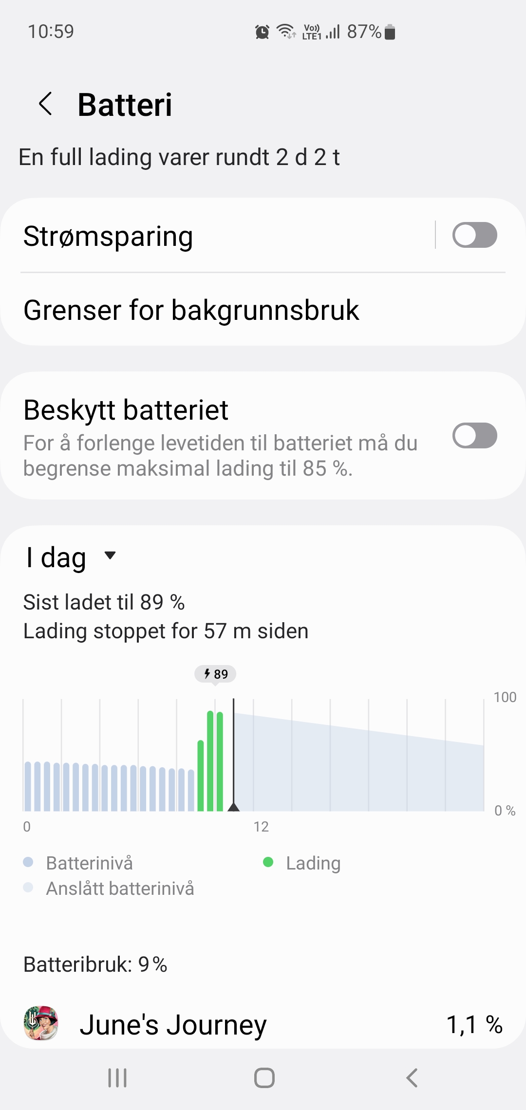 Samsung: På denne telefonen kan du velge å lade kun til 85% for å forlenge levetiden til batteriet ved å velge «Beskytt batteriet»