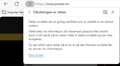 I eksemplet nedenfor kan du se hvordan nettleseren Edge gir informasjon om nettsiden. Hvis det ikke er et hengelåsikon, advarer nettleseren mot å legge igjen sensitiv informasjon som passord og kortinformasjon.