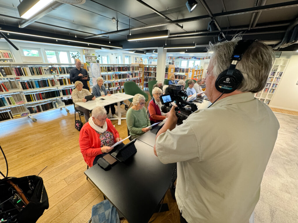 NRK filmer «Seniorsurf» på Biblioteket i Bekkjarvik. Foto: Thomas Halleland.