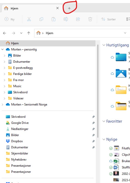 Trykker du på pluss-tegnet (markert med rødt på bildet), så åpner du en ny fane. Da kan du vise ulike mapper på de ulike fanene. Dette er veldig praktisk dersom du sammenligner to områder eller skal kopiere fra ett sted til et annet. Du slipper å lete frem og tilbake på ulike mapper. Istedenfor så klikker du på de ulike fanene.