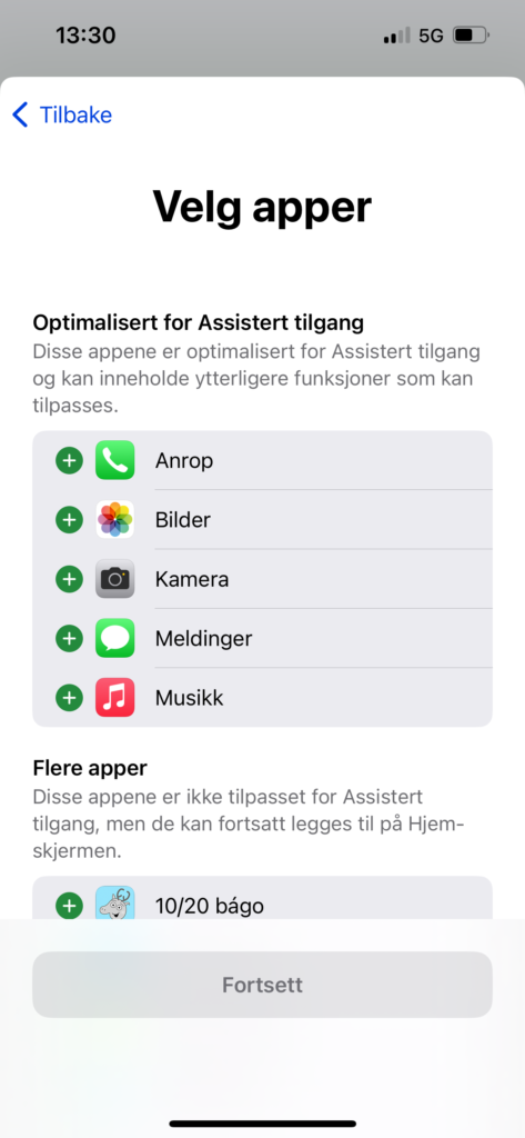 Når assistert tilgang blir aktivert vil løsningen komme med et forslag til apper som er optimalisert for god opplevelse. Det gjelder anrop, bilder, kamera, meldinger og musikk. Dette er apper som kan tilpasses – for eksempel ved at bruker kun kan motta og svare anrop eller meldinger fra utvalgte personer i kontaktlisten.