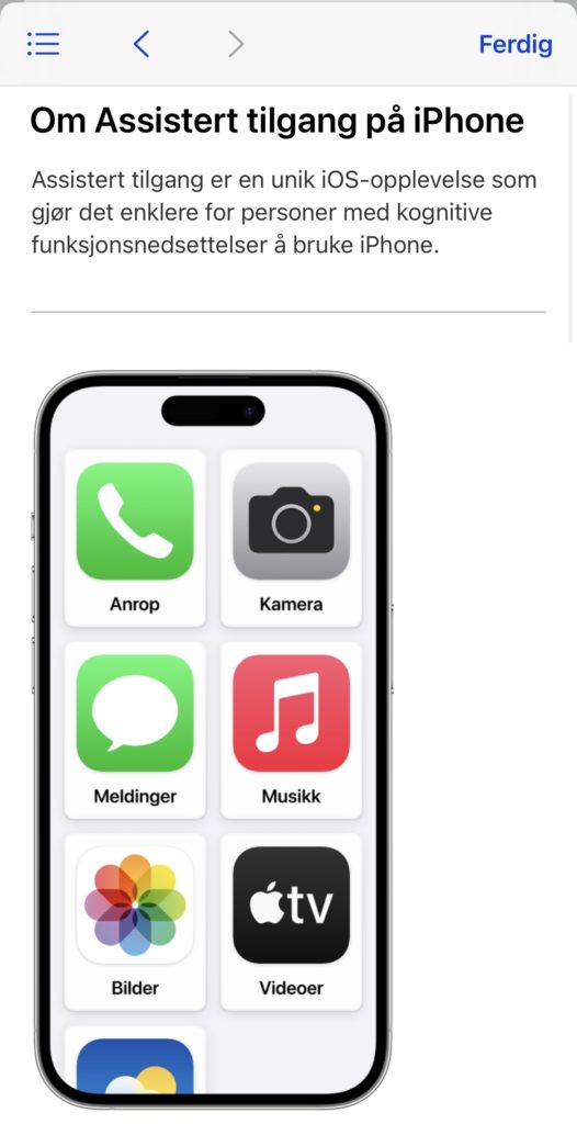 Assistert tilgang er en ny opplevelse i iOS17. Har du ikke oppdatert din iPhone til iOS17 må du gjøre det først. Du finner oppdateringen i «Innstillinger» – «Generelt» – «Oppdateringer».