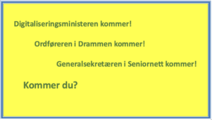 Merk at vi denne gangen ikke skal være i 2. etasje, men 1. etasje. Vi tror at dette er et møte som burde interessere mange, vi er alle seniorer og dette berører oss. Det skal bli spennende å høre hvordan stat og kommune kan svare på den store utfordringen.
