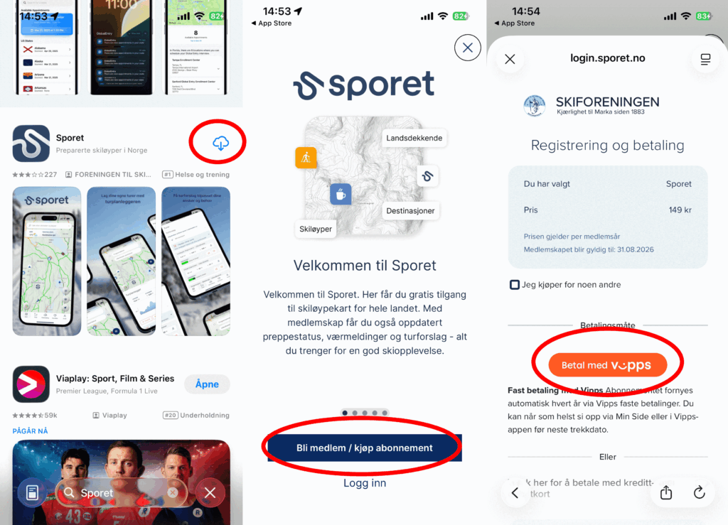 Når du skal installere appen søker du opp «Sporet» i Appstore for iPhone eller Play butikk for Android. Trykk på last ned og installer. Når appen er installert åpner du den og hvis du skal ha den i full versjon velger du «Bli medlem/kjøp abonnement». Dersom du er medlem i Skiforeningen velger du «Logg inn». Skal du kjøpe et abonnement må du velge betalingsform. Det kan være Vipps eller kredittkort. Deretter følger du anvisningene for betaling. Vipps er kanskje den enkleste måte å betale for dette.