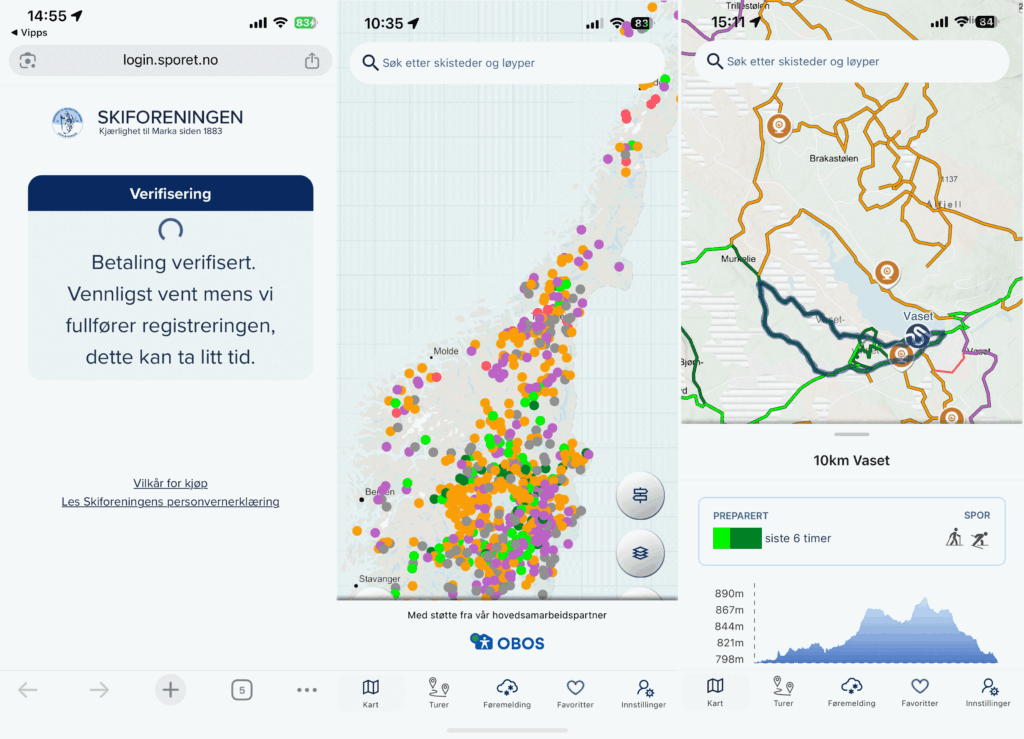 Etter at betaling er utført kommer et bilde opp som viser at betalingen blir registrert i systemene og når den er klar dukker norgeskartet opp. Der ser du alle stedene i landet der det er registrering av løypestatus. Hvis du zoomer inn og velger en løype får du opp informasjonen om løypa. Du ser også hvor lenge det er siden den sist ble preparert.