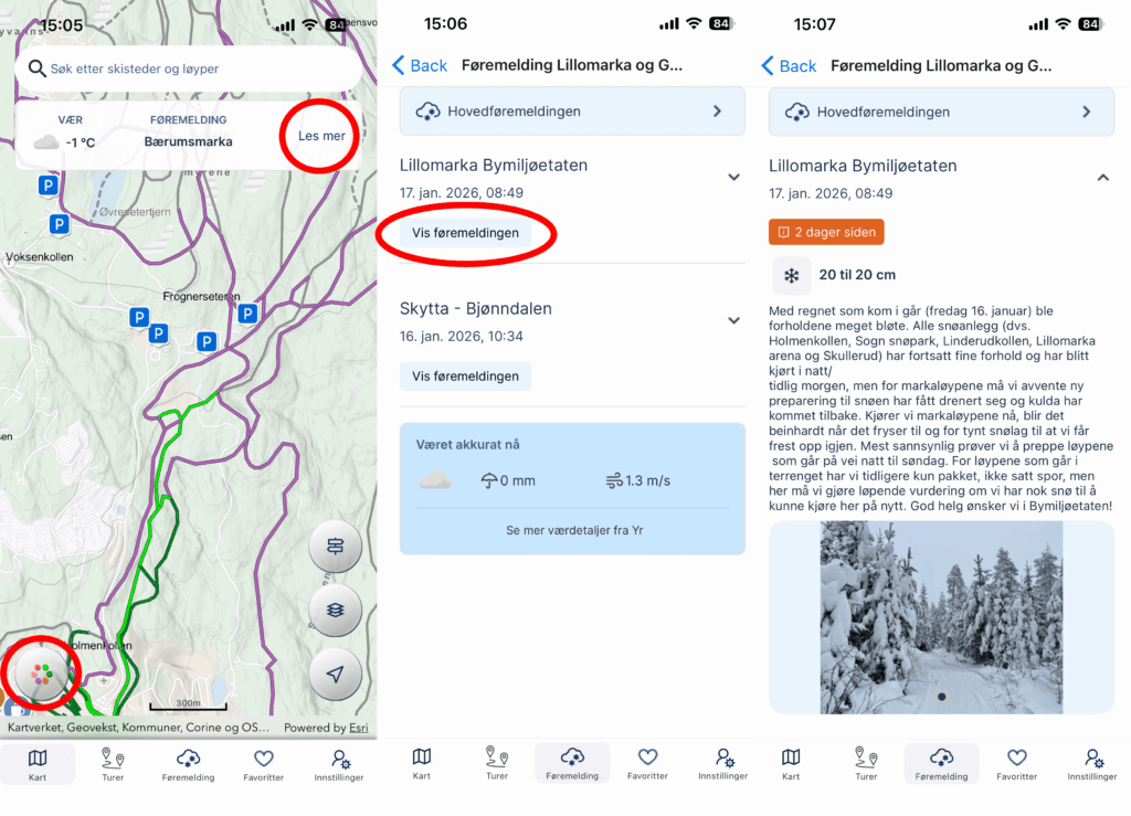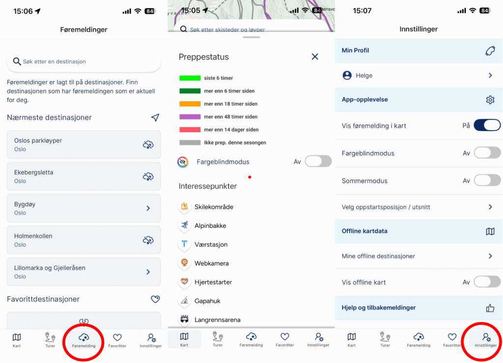 Trykker du på knappen «Føremelding» ser du aktuelle føremeldinger du kan sjekke for de områdene kartet viser. Hvis du har trykt på knappen nederst til venstre i kartet, slik som vist i bildet over dette, får du opp symboler og preppestatus med visning av hva løypefargene betyr. Du kan også slå på fargeblindmodus her. Da blir løypefargene tilpasset fargeblinde og siden det er færre farger som lar seg skille, er noen løypestatusene satt sammen av ulike prikker og streker. Trykker du på knappen «Innstillinger» kan du se kontoen din, sommermodus og legge inn offlinekart og eventuelt vise dem.