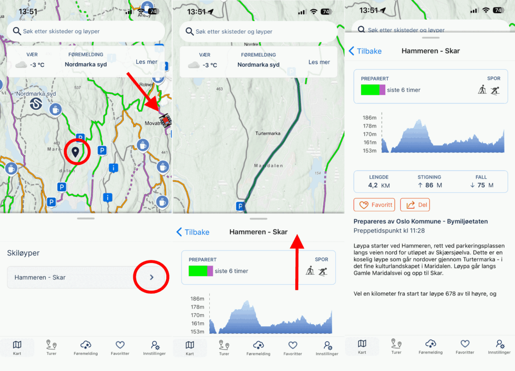 Hvis du trykker inn i kartet på en av løypene, vi du få opp under Skiløyper, de som er aktuelle rett ved der du har trykt. Trykk på den løypen du vil se nærmere på. Du ser litt av informasjonene, men hvis du sveiper opp, slik rød pil viser, får du tilgang til all informasjon. Du ser hvor løypa går fra og til. Når den sist ble preparert. Hva slags spor den har (vanlig og skøyting). Høydeprofil, lengde, stigning og fall, Du får også en beskrivelse av løypa og hvem og når den ble preparert.